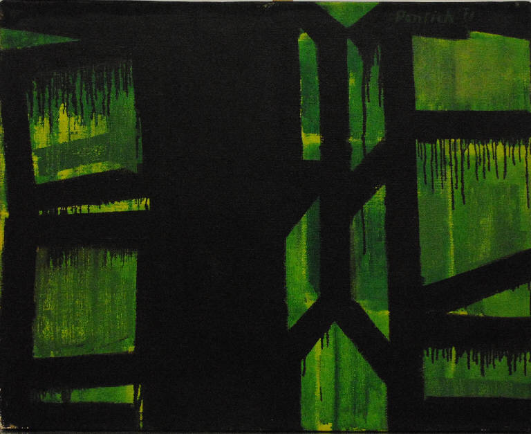 Intorno al perimetro dell'opera è presente un nastro adesivo nero che funge da rudimentale cornice. Composizione d'invenzione articolata in figure quadrangolari nere, su fondo verde, la cui struttura perimetrale nera sembra sfaldarsi in gocciolature di colore.