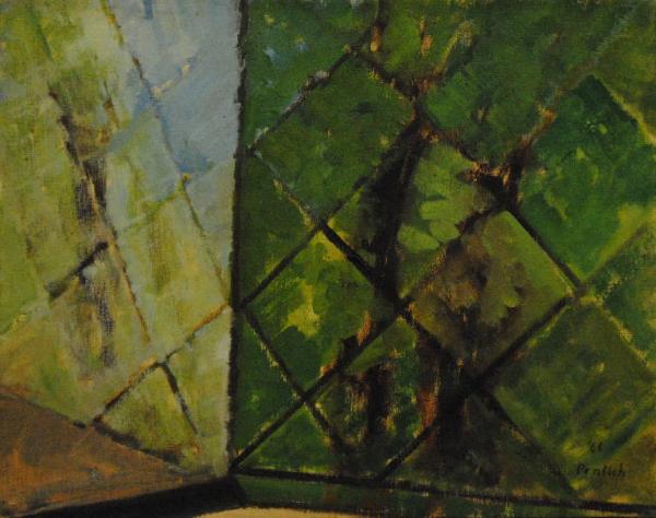L'opera raffigura l'elemento architettonico della finestra; attraverso la grata a forme romboidali è possibile vedere il giardino di piante retrostante riflesso sul vetro della finestra, a sinistra della composizione. L'opera è riconducibile alla sequenza pittorica delle finestre.