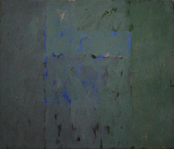 Composizione d'invenzione articolata in forme rettangolari regolari, anche se appena visibili, campite in maniera gestuale nelle tonalità del verde, su fondo azzurro.