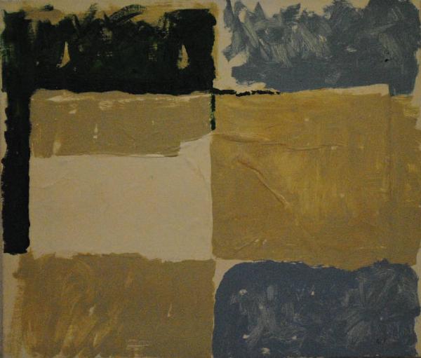 Composizione d'invenzione articolata in superfici quadrangolari di cromie diverse (verde scuro, beige, bianco e celeste).