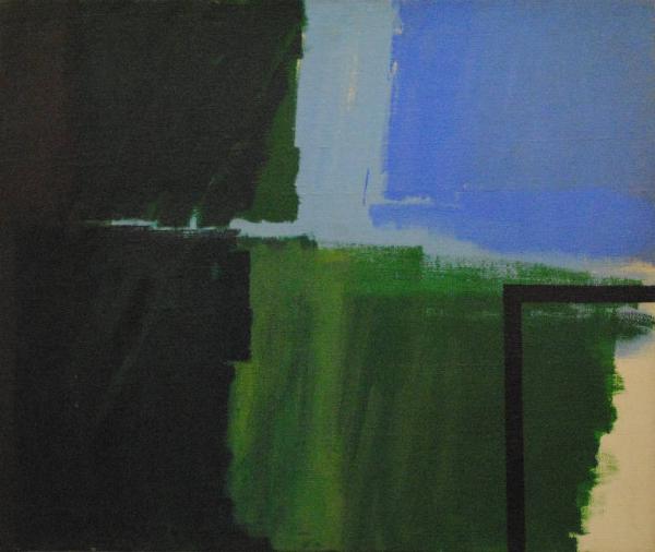 Composizione d'invenzione articolata in superfici cromatiche verdi e azzurre con un inserto di due linee spezzate nere, ortogonali tra loro, in basso a destra.