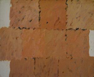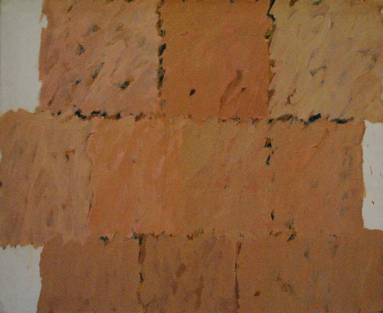 Composizione d'invenzione articolata in forme quadrangolari campite in maniera gestuale nelle tonalità del rosa e che non coprono integralmente la tela in prossimità dei lati verticali.