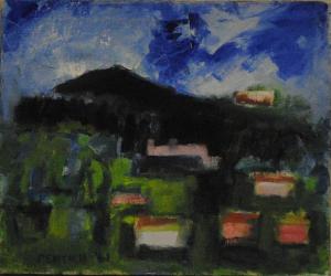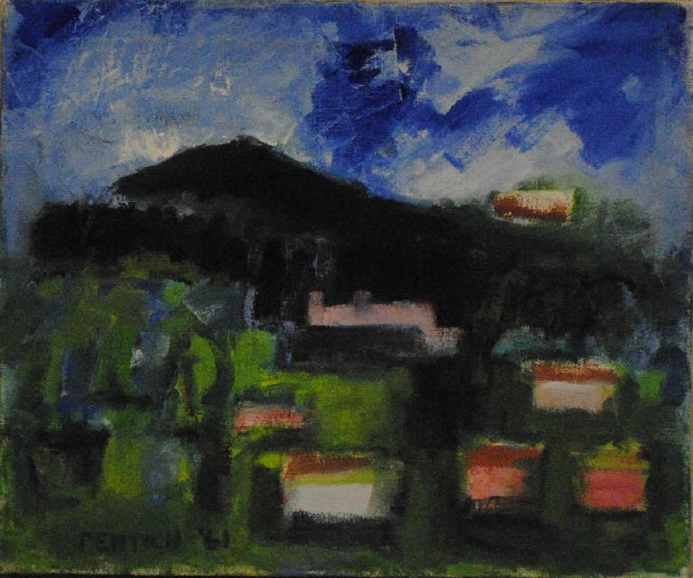 Composizione raffigurante un contesto agreste con casolari stilizzati.