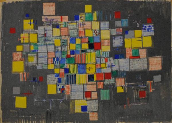 Composizione d'invenzione di ispirazione mondrianea con colore dominante giallo su fondo grigio.