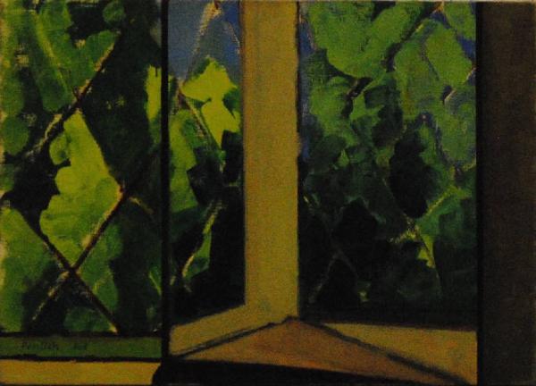Composizione raffigurante l'elemento architettonico della finestra (vetro, grata); il paesaggio esterno è visibile grazie alla trasparenza del vetro. L'opera appartiene alla sequenza delle finestre.