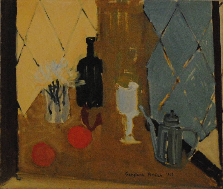 Composizione raffigurante una natura morta; sullo sfondo sono presenti elementi architettonici riconducibili a finestre. L'opera rientra nella sequenza pittorica dedicata alle finestre.