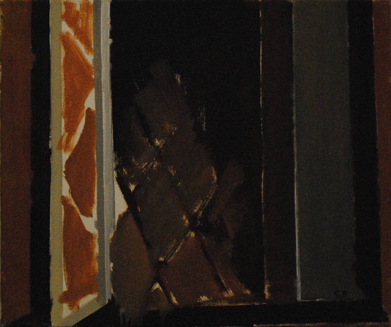 Composizione raffigurante l'elemento architettonico della finestra (scuro, vetro, grata) in cui emerge il contrasto tra i toni ocra del riflesso sul vetro e quelli scuri del resto della composizione. L'opera è riconducibile alla sequenza delle finestre.