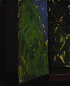 Composizione raffigurante l'elemento architettonico della finestra (vetro, grata); i colori del paesaggio esterno sono visibili sul riflesso del vetro. L'opera appartiene alla sequenza delle finestre.