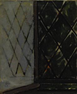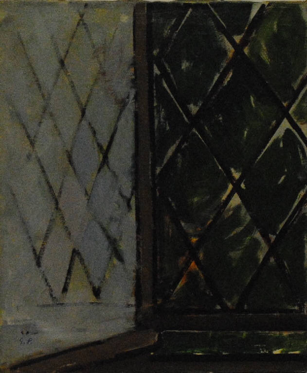 Composizione pittorica raffigurante una grata, la macchia di verde retrostante (probabilmente i giardini di Villa Borghese a Roma) e la riflessione degli elementi romboidali della grata sul vetro della finestra. L'opera è riconducibile alla sequenza delle finestre.