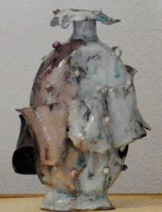 Vaso in ceramica smaltata policroma di ispirazione informale, con drappo, che reca sotto la base la firma aniconica dell'autore consistente in sette punti.