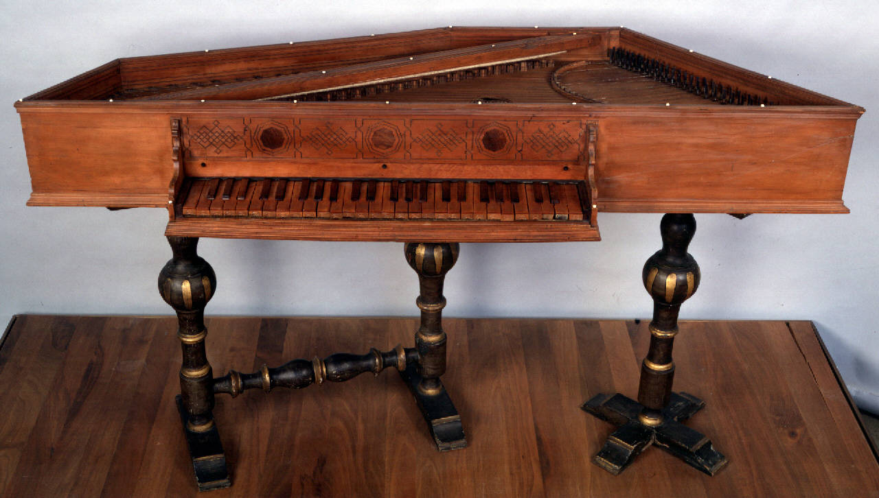 ***Cassa***\nLo strumento, di costruzione leggera, ha sagoma a forma di pentagono irregolare con tastiera sporgente.\nLe fasce di cipresso, unite tra loro ad ugnatura, sono incollate ad appoggio contro i bordi del fondo.\nSopra la tastiera, la fascia frontale presenta una decorazione ad intarsio, con filetti d'ebano e bosso che contornano tre medaglioni ottagonali in legno non identificato. Sulla loro superficie interna, le fasce, eccezion fatta per quella anteriore, sono decorate da due ordini di filetti doppi in ebano - bosso - ebano.\nLe fasce sono listate da tre serie di cornici di cipresso: una lungo il bordo inferiore; una lungo il bordo superiore e la terza, di colmo, filettata in ebano - bosso - ebano, a copertura della costa superiore di ciascuna fascia. Su questa cornice, erano infisse 20 borchie d'avorio, distanziate tra loro 11,5 - 18 mm; attualmente ne sono pervenute 17.\nLe due spallette della tastiera, in cipresso sagomato, sono incollate contro la fascia anteriore.\nIl