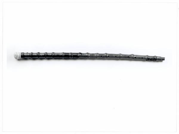 Lo strumento presenta ghiere d'ottone di restauro (per limitare le crepe) e un cannello d'avorio trasversale, al disotto del pomo, destinato a un legaccio.