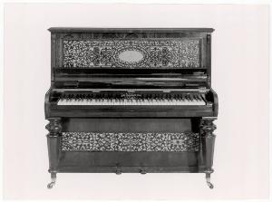 Cassa e sostegno\nLo strumento ha sviluppo verticale con tastiera aggettante.\nI fianchi sono lastronati in palissandro. Il portellone asportabile, sopra la tastiera, è profusamente traforato.\nDue gambe rastremate a sezione esagonale, con rotella al piede, sono poste sotto l'aggetto della tastiera.\n\nTavola armonica e incordatura\nLa tavola armonica è d'abete. Le corde sono fissate con agraffe. L'incordatura è disposta in senso verticale. Le caviglie di ferro hanno testa oblunga e sono forate in tutto l'ambito. \nL'ambito è monocorde da la-1 a mib0, bicorde da mi0 a sol#4, indi tricorde.\n\nTastiera\nLa tastiera, di 85 note, ha per ambito la-1 - la6.\nI tasti diatonici sono ricoperti con lastrine d'avorio in due pezzi. I frontalini sono lastrine piane dello stesso materiale. I blocchetti dei tasti cromatici sono d'ebano.\nI tasti sono guidati nella loro corsa da perni fissati alla traversa anteriore del telaio. Questa traversa delimita anche l'affondo della tastiera.