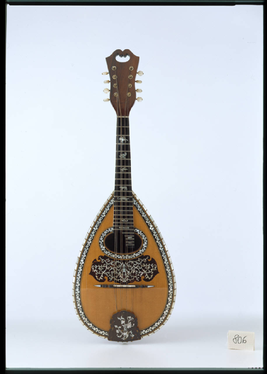 Mandola napoletana in perfette condizioni, realizzata con grande cura da Gennaro Marino, vero specialista della costruzione di strumenti a plettro, capo lavorante di questo settore presso la ditta Monzino.All'interno etichetta a stampa:"Antonio Monzino e Figli/Milano - Via Rastrelli, 10/stabilimento fondato nel 1767/Strumenti musicali a corde/Fatto dal proprio lavorante Gennaro Marino, l'anno 1906/Antonio Monzino". Nome del lavorante, anno e la firma di Antonio Monzino sono manoscritti come d'abitudine.La tavola è in abete in due pezzi speculari a venatura fine, il bordo è decorato con un intarsio a tessere di madreperla annegate nello stucco nero; il motivo é racchiuso tra due filetti di acero tinto e acero naturale a cinque strati. All'esterno la decorazione termina con un giro di tessere di madreperla separate da filetti. Il grande battipenna centrale è realizzato in tartaruga con intarsi in madreperla a tralci vegetali, simile é il paracorde. Il ponte è in ebano con decorazioni.