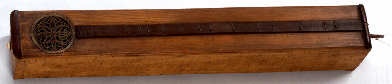 Tasti e tastiera: sulla tastiera sono presenti 19 tasti di metallo (rame?). La tastiera è posta al centro della tavola armonica e non presenta alcun segno di logoramento Accanto a tutti i tasti si legge chiaramente il nome della nota prodotta.\n\nDESCRIZIONE:\nMonocordo anonimo a forma di parallelepipedo con tavola armonica e fondo in legno di abete, lati in legno di acero e capitasto in legno di noce. Al centro della tavola armonica è messa una tastiera costituita da un listello di legno con 19 tasti metallici (rame?) in parte consumati dall¿uso. Ai due estremi dello strumento si trovano un bottone di avorio e una caviglia d¿accordatura di ferro. Quattro piedini di legno di forma quadrata sono stati aggiunti in epoca successiva e corrispondono esattamente a quelli trovati sul monocordo doppio inv. 315. Sulla tastiera sono annotati a inchiostro i nomi delle note corrispondenti ai singoli tasti. La mano sembra essere la medesima visibile sul già citato monocordo con cassa doppia inv. 31.
