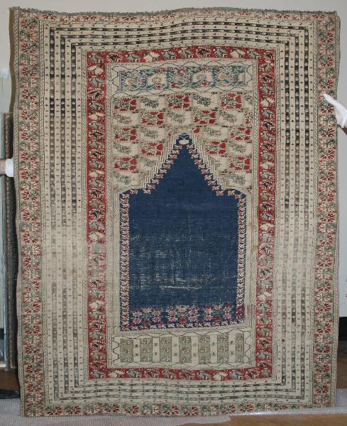 - NOTIZIE STORICO CRITICHE L'opera proviene dall'Anatolia - Ghiordes. Il 10 ottobre 1958, con un gesto munifico, la signora Nedda Grassi donava al Comune di Milano, in memoria del figlio Gino, caduto nella guerra 1940 - 1945, una cospicua raccolta artistica che comprendeva dipinti, esemplari d'arte grafica, tappeti orientali e oggetti d'arte cinese, corredati da un gruppo di libri utili alla conoscenza delle opere stesse. La raccolta è composta nella sua parte più notevole di dipinti italiani e stranieri dell'Ottocento; a questi si aggiungono un piccolo gruppo di epoca antica e un gruppo appartenente all'età contemporanea. Le opere dei precursori dell'impressionismo, quelle degli impressionisti e dei Nabis, di Balla ed alcune della prima attività di Boccioni, che completano la documentazione della corrente futurista del Padiglione d'arte contemporanea, le nature morte di prima maniera di Segantini, per citare solo alcuni dipinti, sono preziosi apporti alle civiche collezioni che possono così dare un panorama dell'arte europea nei secoli XIX e XX. Per desiderio della donatrice, la Raccolta Grassi è esposta tutta nella medesima sede, scelta al secondo piano della Villa Reale (oggi Villa Belgiojoso Bonaparte) e collegata al primo piano con un'elegante scala. L'adattamento è stato compiuto dall'Architetto Ignazio Gardella. Nella successione delle sale e delle opere è stato seguito il criterio cronologico.