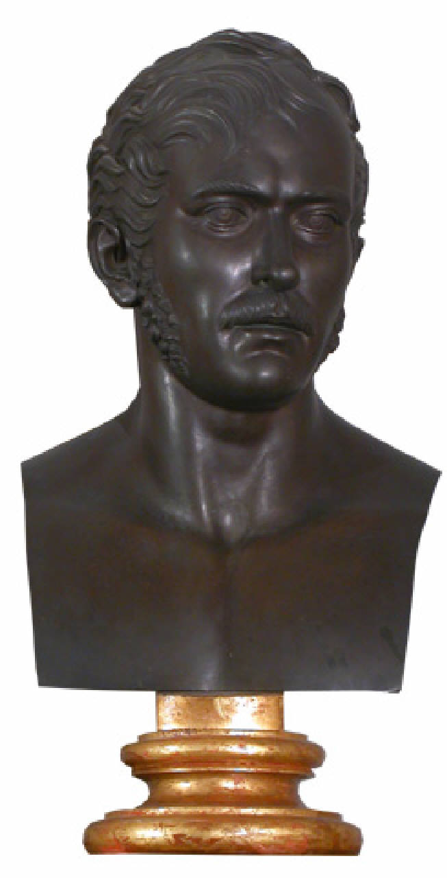 Busto virile in bronzo su piedestallo dorato. Uomo con basette, baffi e capelli mossi