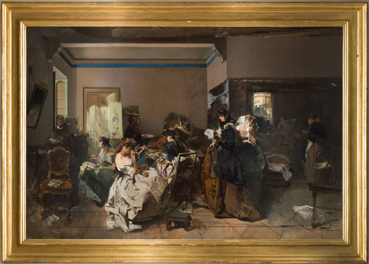 Interno di un locale con donne che cuciono.Abiti d'epoca dai ricchi panneggi. Giochi luministici. Taglio fotografico.