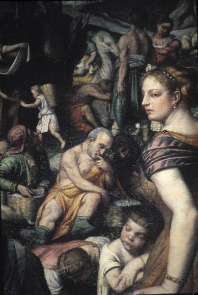 - NOTIZIE STORICO CRITICHE Il dipinto, già su tavola, poi riportato su tela nel 1906, si trova ancor oggi nella sua sede originaria, l'altare dedicato ai Santi Innocenti, eretto dopo il mese di settembre del 1531 e consacrato il 27 dicembre 1532. L'esecuzione dell'opera si colloca quindi tra queste due date ed è da ricondurre a una commissione del padre Innocenzo Casari, che volle così ricordare il nipote Giovanni Casari, morto assassinato nel 1530 e sepolto nella stessa cappella. Apprezzata dalle fonti per l'eccellente tecnica compositiva e oggetto di una composizione in terzine scritta da Francesco Paglia tra il 1660 e il 1675 dove l'autore è definito "Raffaello bresciano", la pala rivela la forte impronta classicista di Moretto, in questo caso influenzato dagli affreschi raffaeleschi delle Stanza Vaticane, noti soprattutto attraverso la circolazione di stampe di riproduzione. Il carattere drammatico della scena è reso sapientemente in una composizione equilibrata, giocata sulla contrapposizione tra le masse e i movimenti della parte inferiore e il serafico Gesù redentore che appare in cielo.