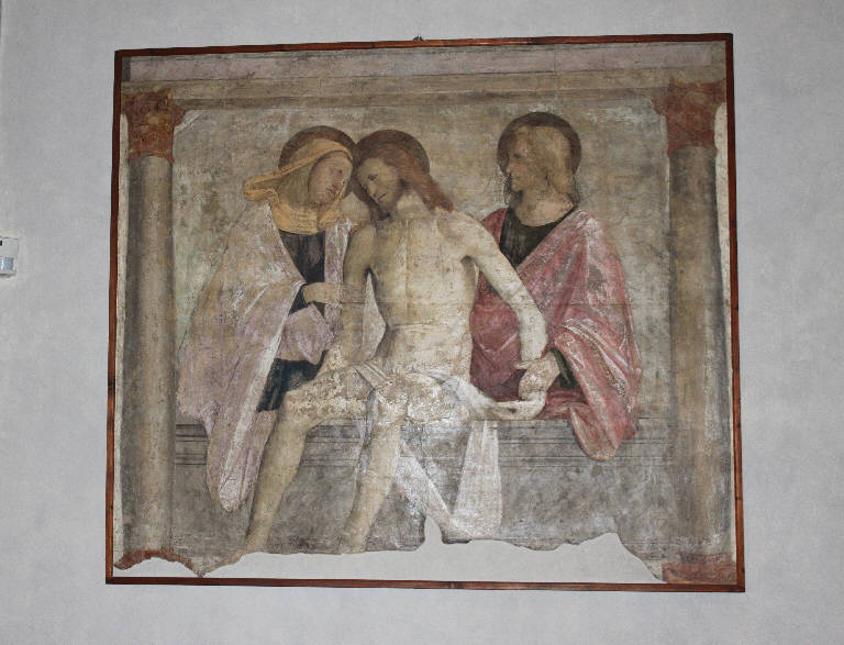 Cristo è seduto su una sarcofago marmoreo dalla sagoma essenziale decorata unicamente da un profilo modanato, ai lati ci sono S. Giovanni che gli stinge la mano e la Madonna che appoggia il capo a quello di Gesù. La composizione è completata da una incorniciatura architettonica composta da due colonne grigie con plinti e capitelli compositi giallo ocra che sostengono un architrave liscio. Le figure sono legate fra loro da un complesso gioco di geometrie formate dalle vesti, dal perizoma che avvolge i fianchi di Cristo, dalle braccia e dalle gambe delle figure. La cromia, dalla consistenza perlacea, si basa su una prevalenza di grigi sui quali la luce si distribuisce a rilevare dettagli anatomici e fisionomie. Nella veste di S. Giovanni si arricchisce di un rosa intenso, con lumeggiature bianche che sottolineano il panneggio.