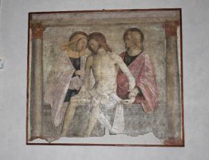 - NOTIZIE STORICO CRITICHE L'affresco, staccato e riportato su tela, proviene da una casa privata situata in contrada del Carmine e viene donato alla chiesa di S. Francesco da Giovanni Battista Bertoni nel 1919. Questi dati erano illustrati da un'iscrizione, ora non più visibile, ma documentata da foto d'epoca, che si trovava nella parte bassa del dipinto. Pubblicato per la prima volta alla fine degli anni trenta del Novecento, è ascritto ad un autore operante nella cerchia di Girolamo Romanino. Le indubbie analogie stilistiche con le opere di quest'ultimo artista hanno orientato la critica nelle attribuzioni successive, che hanno coinvolto oltre allo stesso Romanino, artisti a lui vicini come Francesco Prata da Caravaggio e Altobello Melone. Proprio quest'ultimo riferimento di paternità sembra trovare concorde la storiografia più recente, che individua nella Pietà di S. Francesco quei forti legami con Bramantino e Zenale caratterizzanti le opere note del pittore cremonese. L'opera è databile a secondo decennio del XVI secolo anche alla luce di un confronto con un affresco di soggetto analogo conservato nella chiesa di S. Maria Annunciata a Nave e datato 1512 che mostra i medesimi tratti stilistici.