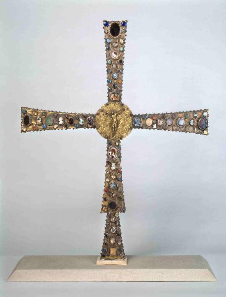 - NOTIZIE STORICO CRITICHE La cosiddetta "Croce di Desiderio" è una delle più grandi croci gemmate giunte fino a noi e, caso unico tra quelle note, presenta il maggior numero di gemme antiche reimpiegate, circa cinquanta, molte delle quali provenienti da precedenti oggetti di ornamento. Le pietre di età imperiale e tardoantica si trovano soprattutto sul verso e il numero elevato testimonia la notevole disponibilità di materiale glittico di alta qualità forse proveniente da antichi tesori imperiali. Sul fronte, dove prevalgono invece gemme medievali, spicca il celebre medaglione vitreo con i ritratti in foglia d'oro della metà del III sec. d.C.: il medaglione riproduce un gruppo famigliare, una madre con i due figli, e la scritta in caratteri greci si riferisce probabilmente al capo famiglia, Vunnerio Cerami.\nI pezzi attribuibili all'età altomedievale costituiscono un nucleo importante in quanto assai numerosi e probabilmente contemporanei alla lavorazione della croce; tra essi assumono notevole significato due pseudo-cammei a doppio strato (metà VIII-IX sec. d.C.) e diciotto gemme in pasta di vetro decorate a stampo, realizzate nella stessa bottega. Su di esse prevalgono ritratti di eco classica, declinati nei toni del blu e del verde, colore prevalente nella decorazione della croce. \nQuesto capolavoro di oreficeria altomedievale, databile alla seconda metà del IX secolo, si presenta integro nel suo aspetto complessivo, ma ha subìto nel tempo manutenzioni e cambiamenti continui, forse legati proprio all'uso processionale. Ne sono testimonianza le numerose sostituzioni quale, ad esempio, il ricollocamento nel 1812 di diciassette pietre per rimpiazzare alcune gemme "pagane" asportate dalle monache, perché ritenute offensive del sentimento cristiano.\nSecondo la tradizione la croce è donata al monastero di S. Salvatore e S. Giulia dal re longobardo Desiderio, che insieme alla moglie Ansa lo fonda tra il 753 e il 760.\nIl prezioso oggetto è esposto al piano superiore dell'Oratorio di S. Maria in Solario, edificio di età romanica riservato alle funzioni liturgiche delle monache, che anticamente custodiva il tesoro del monastero. Da questo luogo la croce veniva prelevata dalla badessa il Venerdì Santo per portarla nel Coro delle Monache e quindi sull'altare maggiore della chiesa di S. Salvatore per l'adorazione. Alla fine del XVIII secolo la croce risulta già esposta in S. Maria in Solario "sopra un altare in mezzo a molte torce ardenti", ma nel 1798 il Governo della Repubblica Cisalpina sopprime l'ordine monastico e il tesoro del monastero di è disperso: alcuni degli oggetti più preziosi (la Croce, l'Evangelario Purpureo e la Lipsanoteca) sono trasferiti nella Biblioteca Queriniana, dove la croce è conservata fino al 1882, anno in cui è trasferita nel Museo dell'Età Cristiana in S. Giulia e in seguito nella Pinacoteca Tosio Martinengo. Dal 1993 la Croce è stata ricollocata nella sua sede originaria.