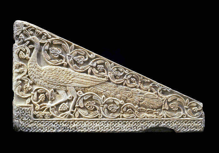 - NOTIZIE STORICO CRITICHE Questa lastra di ambone costituisce uno degli esempi più importanti e raffinati della scultura altomedievale in Italia e proviene con certezza dalla basilica di S. Salvatore nella quale è esposta tuttora. I dettagli del volatile, soprattutto il ricco piumaggio, sono resi con notevole capacità calligrafica che conferisce al rilievo movimento e naturalismo, memori della tradizione bizantina e tardoantica.\nLa lastra, insieme con una analoga e simmetrica di cui restano solamente tre frammenti, doveva costituire il parapetto di due scale affrontate che portavano ad un ambone, dal quale venivano letti i testi sacri e pronunciate le omelie nella chiesa innalzata dal re longobardo Desiderio. I due pavoni quindi dovevano risultare affrontati sul lato principale, simbolo evidente di Resurrezione e Immortalità dell'anima. \nIl bassorilievo è a ragione ritenuto una delle sculture altomedievali di maggiore interesse, sia per le innegabili qualità stilistiche, sia per la sua notevole integrità. Conservato continuativamente nel monastero di S. Salvatore e S. Giulia, nel XVI secolo è preso a modello per una decorazione ad affresco dipinta sulle pareti di uno dei chiostri. A partire dall'Ottocento è stato costante oggetto di studio e caposaldo di ogni valutazione sul contesto della fabbrica di S. Salvatore.\nLa cronologia all'VIII secolo appare oggi pressoché concordemente condivisa. In particolare, si deve pensare a una sua collocazione entro la basilica di età desideriana. Il riesame globale della seconda fase edilizia di questo edificio di culto, sia dal punto di vista delle strutture che dell'apparato decorativo, e il confronto incrociato fra pitture, stucchi, terrecotte e elementi marmorei, indicano infatti con evidenza che la committenza del re longobardo era particolarmente sensibile alla ripresa programmatica di motivi e forme legate alla tradizione bizantino-ravennate. La sua erezione rappresenta il degno e prestigioso suggello di precise scelte politiche e tutto ciò che vi era contenuto doveva conformarsi ad esse, esibendo attraverso formule estetiche adeguate, riferimenti di più ampia portata, cosa che puntualmente avviene anche a proposito della lastra in esame e delle altre sculture appartenenti al medesimo ciclo decorativo.
