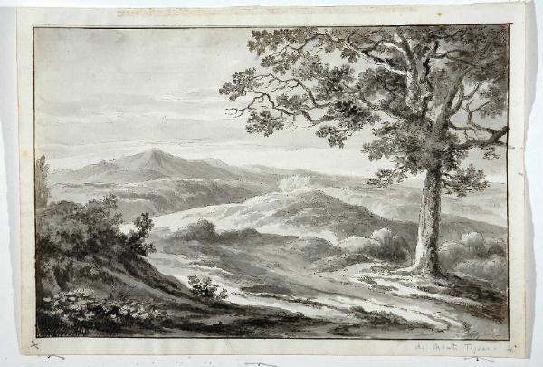 - NOTIZIE STORICO CRITICHE La data post-quem è desunta la disegno dello stesso autore con n. inv. 5055.\nDue foto in bn del disegno sono conservate nell'album "D 6 bis 1800-1900", una di queste riproduce, ingrandendola, la firma; sul foglio su cui sono applicate le foto si trovano le scritte a matita, di pugno di Riccardo Lampugnani, "Monti Tiziano (emiliano? - 1850?)" e "(in parte venduto a Bolzani) 1980". Un'altra foto, a colori e con data stampata "dic. 72" si trova nell'album "D 6 1800-1900". Da tutte queste foto è evidente il particolare che il foglio è rilegato in un album, che doveva contenere gli altri nove disegni dello stesso artista pervenuti al Poldi Pezzoli, oltre ad altri sei disegni, fotografati ma non pervenuti al museo, molto probabilmente perchè venduti da Lampugnani alla Galleria Bolzani di corso Matteotti a Milano dopo avere sciolto la rilegatura dell'album.\nLa mancanza della minima documentazione sull'autore consente solo confronti stilistici con altri artisti del periodo compreso tra il 1770 circa e il 1830 circa, ed accettando l'indicazione fornita da Lampugnani sull'ambito emiliano. Il periodo è da me ipotizzato tenendo conto della data scritta dall'autore sul disegno n. inv. 5055, "1796", molto probabilmente data di esecuzione del disegno stesso, utile per abbozzare un tentativo di definizone di data di nascita dell'autore, che per ragioni stilistiche ritengo non possa di molto precedere il 1770. Il 1830 come ante quem riguarda non tanto la possibile data di morte quanto la data più plausibile per la collocazione stilistica di questo gruppo di disegni. Il tipo di paesaggio in essi rappresentato infatti pur essendo convenzionale si discosta dalla concezione classicista del paesaggio in voga nel settecento in Emilia Romagna, per fare propria la visione più ariosa, aperta, "sensistica" della natura, che inizia a diffondersi nei primi anni dell'ottocento, in cui la scena di genere viene abolita o ridotta a dimensioni molto ridotte, a inaugurare quell'attenzione alla natura come forza che sovrasta l'uomo, propria della cultura pre-romantica e romantica. In particolare i forti contrasti chiaroscurali degli alberi e dei dossi in primo piano ricordano un disegno acquarellato di Felice Giani, "Veduta di Imola", datato 1805 e conservato nella collezione della Cassa di Risparmio di Bologna (Manfrini e Orlandi 1992).