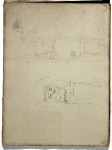 carta bianca ingiallita; matita; il foglio è stato diviso da Bossoli in due metà e reca due disegni distinti: si esamina in questa scheda il disegno sulla metà destra del foglio, che si legge ruotando il taccuino di 90 gradi in senso antiorario