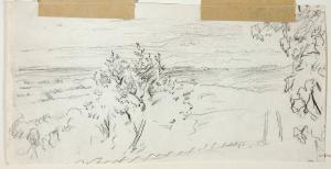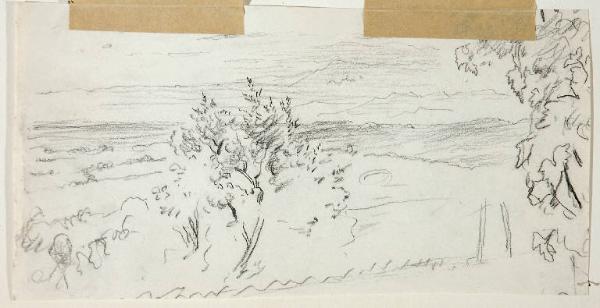 - NOTIZIE STORICO CRITICHE Il disegno fa parte di un insieme, con numeri di inventario da 5008 a 5026, conservati da Riccardo Lampugnani in una cartelletta di cartone con etichetta che reca l'iscrizione a penna "Luigi Bertelli 20 disegni originali" e, sempre a penna: "1852-1916, e altri". I disegni pevenuti al museo Poldi Pezzoli sono 19. Il disegno mancante è documentato da una foto nell'Album "D 15" e rappresenta una piccola figura femminile davanti a un albero. Nello stesso Album è conservata una foto in b/n del presente disegno (recto). La datazione post quem proposta indica il periodo tardo dell'attività di Bertelli, caratterizzato dallo studio dal vero (prediletto dall'artista) del paesaggio reso con un tratto sintetico in una impaginazione di ampio respiro che spesso presenta un punto di vista lontano e rialzato. Il paesaggio di questo disegno è solo abbozzato e il fatto che sia stato ritagliato senza rispettare l'inquadratura testimonia che è stato eseguito prima rispetto a quello sul recto.