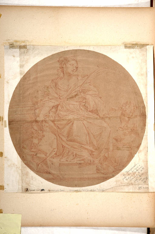 - NOTIZIE STORICO CRITICHE Una nota a penna, in corsivo antico, posta sul controfondo, riferisce il disegno a Donato Creti. Riccardo Lampugnani ha poi annotato, in basso a destra, un riferimento alla "Temperanza" di Donato Creti, appartenente alla seria commissionata all'artista bolognese da Marco Antonio Collina Sbaraglia e ora conservata nelle Collezioni Comunali d'Arte di Bologna. Il riferimento è esatto: ma il foglio, nonostante alcune lievi differenze rispetto al dipinto finito, non è, a mio avviso, uno studio preparatorio. Il tratto, infatti, preciso e fine, ma debole, non ha le qualità di sicurezza e raffinatezza estrema che mostra abitualmente Donato Creti: si tratta quindi probabilmente di una copia antica, eseguita forse nella cerchia degli allievi dell'artista bolognese. Foto del disegno sono conservate nell'album Lampugnani D.1 (negativo Perotti n° 23440) e D.2.
