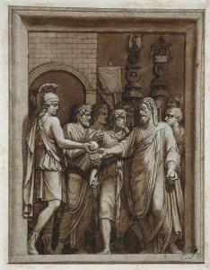 - NOTIZIE STORICO CRITICHE Il disegno è uno studio preparatorio assai rifinito per la tavola n° 6 delle "Admiranda Romanorum Antiquitatum ac veteris sculpturae vestigia anaglyphico opere elaborata ex mamroreis exemplaribus quae Romae adhuc extant in Capitolio aedibus hortisque virorum principum ad antiquam elegantiam a Petro Sancti Bartoli delieneata incisa...", volume di antichità romane disegnate e incise da Pietro Sante Bartoli (Perugia 1635-Roma 1700), pubblicate a Roma nel 1693 per cura di Gio. Giacomo Rossi. La tavola riproduce fedelmente l'antico bassorilievo raffigurante l' "Ingresso di Adriano in Roma", murato nel 1573 nella parete sinistra del primo ripiano del Palazzo dei Conservatori a Roma, e proveniente dal perduto arco onorario posto un tempo presso piazza Sciarra (cfr. "Rilievi storici capitolini. Il restauro dei pannelli di Adriano e Marco Aurelio nel Palazzo dei Conservatori", a cura di E. La Rocca, Roma 1986, pp. 12-16).