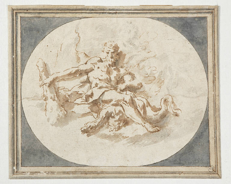 In ovale, riquadrato a penna. A penna, inchiostro bruno, acquerello bruno, acquerello grigio su cartoncino bianco.
