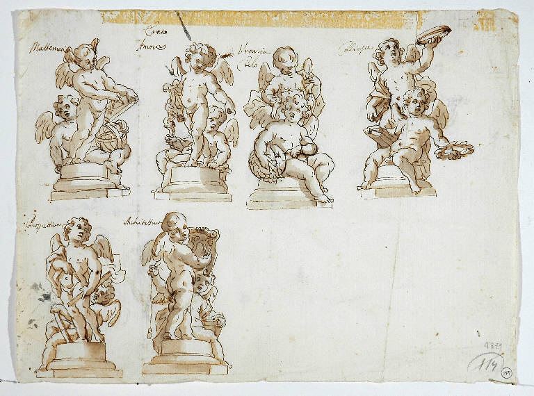 Sei studi per coppie allegoriche di putti, destinate a raffigurare le arti . Penna, inchiostro bruno e acquerello bruno su carta bianca.