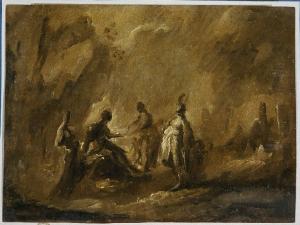 - NOTIZIE STORICO CRITICHE Una foto del disegno è conservata nell'album Lampugnani D.1 (negativo n° 23035 Perotti): accanto alla foto, una nota a matita di Riccardo Lampugnani riferisce il bozzetto a Giovanni Antonio Pellegrini e propone di identificarlo con uno degli studi preparatori eseguiti dall'artista veneto per la grande tela con il "Matrimonio dell'Elettore Palatino con Anna Maria Luisa de' Medici", dipinta nel 1714 (Monaco, Schleissheim; un bozzetto è conservato presso la National Gallery di Londra; Cfr. G. Knox "Antonio Pellegrini 1675-1741, Oxford 1995, pp. 235-236, fig. 90-91). Sul cartoncino grigio di supporto al disegno è applicato un ritaglio di giornale con la foto del bozzetto eseguito dal Pellegrini per il dipinto citato, e ora conservato a Londra: e alcuni appunti riferiscono altre ipotesi di attribuzione, a Tiepolo (N. Donzelli) e a Pittoni. Il nome di Pellegrini è, a mio avviso, da confermare, per questo bozzetto tracciato a pennellate rapide, fluenti, nervose: si veda, ad esempio, per confronto, il "Martirio di S. Dionigi" ad olio su carta, del 1722-25 circa (in Knox cit., p. 248, fig. 123). Non mi sembra convincente, invece, l'accostamento con la grande tela di Monaco, in cui torna appena la figura maschile con l'elmo (l'Elettore Palatino Johann Wilhelm), ma che è di impostazione del tutto diversa.
