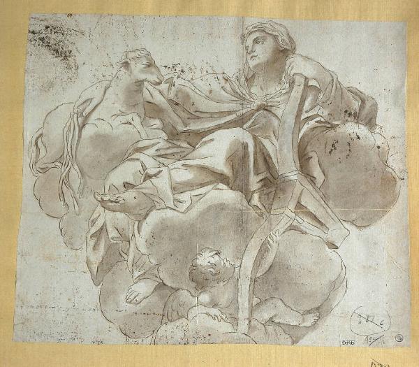 - NOTIZIE STORICO CRITICHE Il foglio, che non reca alcuna attribuzione, è una copia con lievi varianti del cartone preparatorio eseguito, tra il 1689 e il 1691, da Marcantonio Franceschini per la "Allegoria dell'Umiltà" destinata a ornare uno dei pennacchi della chiesa bolognese del Corpus Domini (Princeton, Art Museum Princeton University; cfr. fig. 38h in D.C. Miller "Marcantonio Franceschini", Torino 2001). La copia, a mio avviso, è stata probabilmente eseguita all'interno della bottega del maestro, tra la fine del XVII e l'inizio del XVIII secolo.