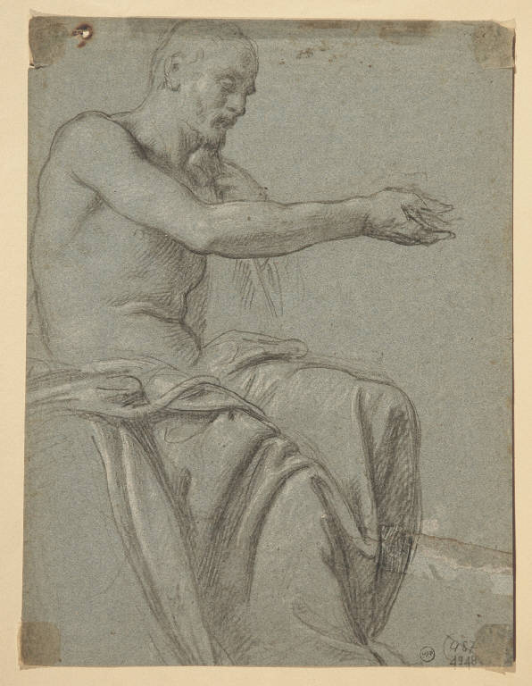 - NOTIZIE STORICO CRITICHE Il disegno, un interessante studio accedemico di figura maschile e, al verso, di figura femminile e di panneggio, condotto con fermo tratto di contorno a matita nera grassa e lumeggiato a gessetto bianco, non reca alcuna attribuzione tradizionale: ma è senz'altro da assegnare, a mio avviso, alla cerchia di Annibale Carracci, anche se non trova al momento un esatto riscontro con la grafica conosciuta dei più noti tra i suoi allievi. Il nome di Francesco Albani, in particolare, mi sembra suggestivo, per l'innegabile affinità d'impostazione che lega questo studio di figura al "Cristo" e al "San Giovanni Battista" dipinti dall'artista bolognese nel 1621 per il cardinale Benedetto Giustiniani, all'interno di una serie dedicata a Cristo, appunto, e ai dodici apostoli (si veda S. Danesi Squarzina "The collection of Cardinal Benedetto Giustiniani. Part II", in "The Burlington Magazine", n° 1139, febbraio 1998, pp. 102-120).