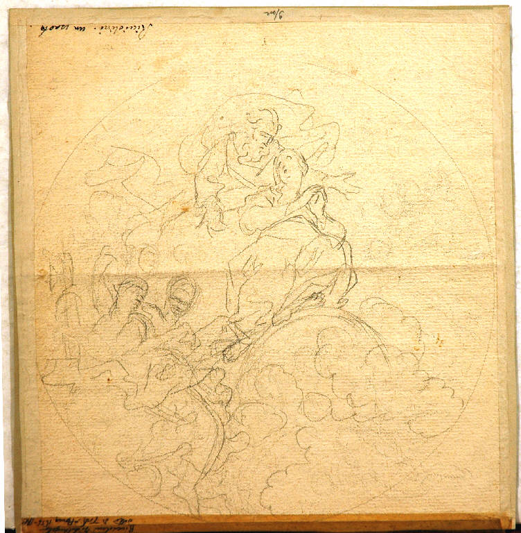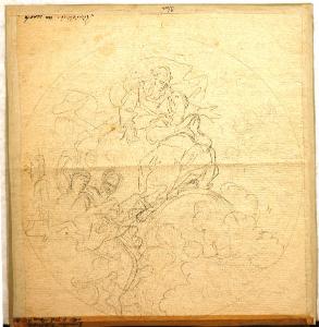 - NOTIZIE STORICO CRITICHE Una foto del disegno è conservta nell'album Lampugnani D.2 (negativo 23443 Perotti): una seconda foto è conservata nell'album D. 3 (vol. 3). Al verso del foglio una scritta antica riferisce il foglio a "Ricciolini": sul cartoncino di supporto, una nota di Riccardo Lampugani precisa l'attribuzione, proponendo il nome di Michelangelo Ricciolini, buon pittore marattesco e gran decoratore di palazzi e ville. Il nome di Ricciolini è probabilmente da confermare: al verso, lo studio appena accennato a matita per la stessa composizione è da assegnare alla stessa mano.