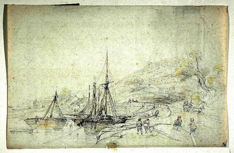 Recto: veduta di porto di lago, presso un bosco, con figure; a matita nera e pastelli colorati su carta bianca. Verso: paesaggio con recce e figure; a matita nera e pastelli colorati su carta bianca.
