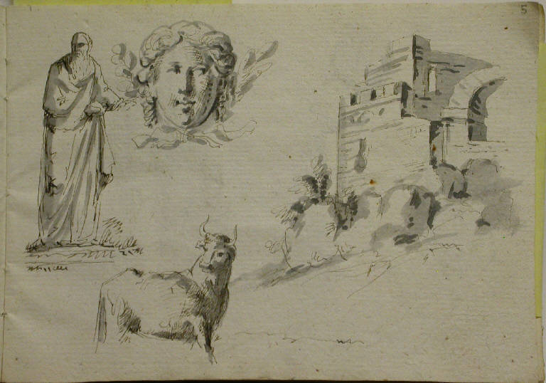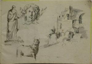 Da sinistra: studio di figura maschile con lunga barba e toga romana; studio di motivo decorativo a mascherone; studio di paesaggio, con veduta parziale di castello; rapido schizzo di toro.