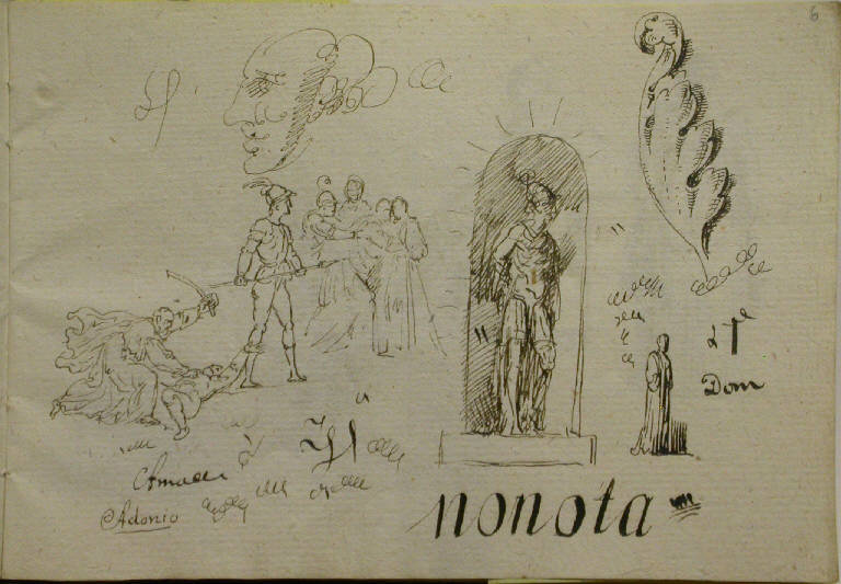 Da sinistra: studio per scena di aggressione; studio di figura maschile con elmo e lancia; gruppo di figure e, in alto, studio di profilo maschile; figura maschile con elmo, entro nicchia; figura con lunga veste, appena accennata; motivo decorativo vegetale.