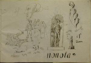 - NOTIZIE STORICO CRITICHE Non sappiamo quando questo interessante taccuino d'appunti, composto di studi di figure e d'architettura, di paesaggio e di decorazione, e di schizzi di episodi della vita di Napoleone, sia entrato a far parte della collezione di Riccardo Lampugnani; e nessuna attribuzione è mai stata proposta per cercare di individuarne l'autore. La sola informazione, una scritta a matita, compare sulla terza di copertina: "Copie da Orazio Vernet, Storia di Napoleone, su l'Ardèche". Indicazione preziosa, perchè consente almeno di precisare la data di una parte del taccuino: i disegni di tema napoleonico che l'anonimo artista ha tracciato, con mano veloce e sintetica, sull'intera seconda parte del volumetto, a partire dalla carta 7 verso, sono tratti dalle vignette che Horace Vernet aveva disegnato per la "Histoire de l'empereur Napoléon" scritta da Paul Mathieu Laurent de l'Ardèche e pubblicata a Parigi nel 1839; nello stesso anno, la tipografia torinese Fontana pubblicò la prima edizione italiana del testo, per le cure di Antonio Lissoni, che era stato ufficiale di Napoleone ("Storia di Napoleone di P.M. Laurent de l'Ardèche illustrata da Orazio Vernet voltata in italiano da Antonio Lissoni e da esso cresciuta delle imprese militari delle soldatesche italiane", Torino, Fontana, 1839). Questa edizione, senza dubbio, aveva sotto gli occhi l'anonimo autore del taccuino Lampugnani: ne copia, infatti, talvolta, brevi brani, o frasi; e annota rapidamente, con un segno a penna libero e sicuro, appena rilevato dall'acquerello grigio, i disegni di Horace Vernet che più attirano la sua attenzione. Spesso, di quelle vignette, appunta solo dei particolari: come per memoria, durante la lettura. E' possibile che quei disegni l'artista li abbia eseguiti in anni assai vicini alla data della pubblicazione del volume; e quindi attorno al 1839, o poco oltre, per l'inflessione ancora nettamente neoclassica che rivelano i primi fogli del volumetto, ricchi di piccoli studi di figure, di paesaggio, di motivi d'ornato: oltre la metà del secolo, infatti, quell'aria settecentesca sarebbe del tutto fuori tempo. Chi sia però l'autore di questi disegni, non è facile dire: anche se, a mio parere, il tratto a penna netto e pulito, l'acquerellatura veloce delle vignette di tema napoleonico sono assai vicini a quelli che usa Massimo D'Azeglio (Torino 1798 - 1866) in certi suoi libretti d'appunti degli anni '20 e '30 del XIX secolo (cfr. ad esempio le tavole n°66-67, pp. 116-117, in "Massimo D'Azeglio. Mostra organizzata dalla città di Torino nel primo centenario della morte", Torino, 1966).