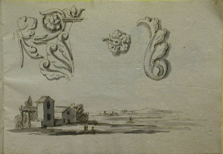 In alto: studi di motivi decorativi vegetali; in basso: paesaggio con edifici rurali.