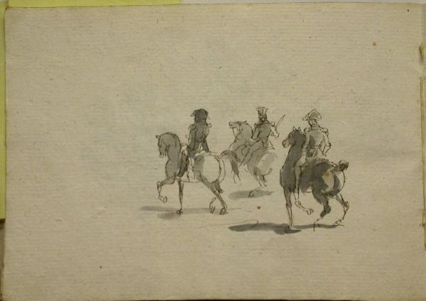- NOTIZIE STORICO CRITICHE Non sappiamo quando questo interessante taccuino d'appunti, composto di studi di figure e d'architettura, di paesaggio e di decorazione, e di schizzi di episodi della vita di Napoleone, sia entrato a far parte della collezione di Riccardo Lampugnani; e nessuna attribuzione è mai stata proposta per cercare di individuarne l'autore. La sola informazione, una scritta a matita, compare sulla terza di copertina: "Copie da Orazio Vernet, Storia di Napoleone, su l'Ardèche". Indicazione preziosa, perchè consente almeno di precisare la data di una parte del taccuino: i disegni di tema napoleonico che l'anonimo artista ha tracciato, con mano veloce e sintetica, sull'intera seconda parte del volumetto, a partire dalla carta 7 verso, sono tratti dalle vignette che Horace Vernet aveva disegnato per la "Histoire de l'empereur Napoléon" scritta da Paul Mathieu Laurent de l'Ardèche e pubblicata a Parigi nel 1839; nello stesso anno, la tipografia torinese Fontana pubblicò la prima edizione italiana del testo, per le cure di Antonio Lissoni, che era stato ufficiale di Napoleone ("Storia di Napoleone di P.M. Laurent de l'Ardèche illustrata da Orazio Vernet voltata in italiano da Antonio Lissoni e da esso cresciuta delle imprese militari delle soldatesche italiane", Torino, Fontana, 1839). Questa edizione, senza dubbio, aveva sotto gli occhi l'anonimo autore del taccuino Lampugnani: ne copia, infatti, talvolta, brevi brani, o frasi; e annota rapidamente, con un segno a penna libero e sicuro, appena rilevato dall'acquerello grigio, i disegni di Horace Vernet che più attirano la sua attenzione. Spesso, di quelle vignette, appunta solo dei particolari: come per memoria, durante la lettura. E' possibile che quei disegni l'artista li abbia eseguiti in anni assai vicini alla data della pubblicazione del volume; e quindi attorno al 1839, o poco oltre, per l'inflessione ancora nettamente neoclassica che rivelano i primi fogli del volumetto, ricchi di piccoli studi di figure, di paesaggio, di motivi d'ornato: oltre la metà del secolo, infatti, quell'aria settecentesca sarebbe del tutto fuori tempo. Chi sia però l'autore di questi disegni, non è facile dire: anche se, a mio parere, il tratto a penna netto e pulito, l'acquerellatura veloce delle vignette di tema napoleonico sono assai vicini a quelli che usa Massimo D'Azeglio (Torino 1798 - 1866) in certi suoi libretti d'appunti degli anni '20 e '30 del XIX secolo (cfr. ad esempio le tavole n°66-67, pp. 116-117, in "Massimo D'Azeglio. Mostra organizzata dalla città di Torino nel primo centenario della morte", Torino, 1966). \nL'anonimo autore del taccuino riprende in parte, in questo foglio, la vignetta che illustra un episodio avvenuto l'11 dicembre 1808, durante la guerra di Spagna (Laurent de l'Ardèche, Torino 1839, p. 511): Napoleone passa in rivista la sua cavalleria e il corpo dei lancieri polacchi, schierati al Prado. La copia, quasi un rapido appunto preso con tratto veloce e sintetico, è parziale: l'artista ripete solo le figure dei tre cavalieri sulla destra, trascurando la scena urbana e lo schieramento di truppe che Horace Vernet aveva disegnato sulla sinistra.