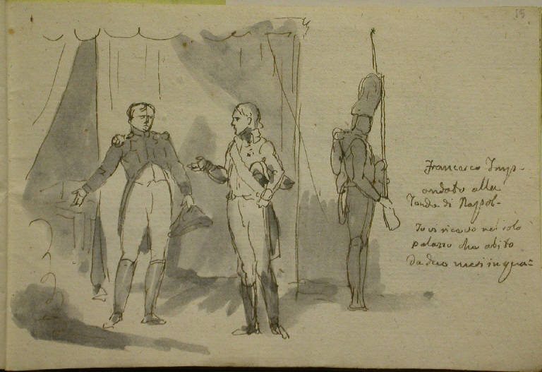 - NOTIZIE STORICO CRITICHE Non sappiamo quando questo interessante taccuino d'appunti, composto di studi di figure e d'architettura, di paesaggio e di decorazione, e di schizzi di episodi della vita di Napoleone, sia entrato a far parte della collezione di Riccardo Lampugnani; e nessuna attribuzione è mai stata proposta per cercare di individuarne l'autore. La sola informazione, una scritta a matita, compare sulla terza di copertina: "Copie da Orazio Vernet, Storia di Napoleone, su l'Ardèche". Indicazione preziosa, perchè consente almeno di precisare la data di una parte del taccuino: i disegni di tema napoleonico che l'anonimo artista ha tracciato, con mano veloce e sintetica, sull'intera seconda parte del volumetto, a partire dalla carta 7 verso, sono tratti dalle vignette che Horace Vernet aveva disegnato per la "Histoire de l'empereur Napoléon" scritta da Paul Mathieu Laurent de l'Ardèche e pubblicata a Parigi nel 1839; nello stesso anno, la tipografia torinese Fontana pubblicò la prima edizione italiana del testo, per le cure di Antonio Lissoni, che era stato ufficiale di Napoleone ("Storia di Napoleone di P.M. Laurent de l'Ardèche illustrata da Orazio Vernet voltata in italiano da Antonio Lissoni e da esso cresciuta delle imprese militari delle soldatesche italiane", Torino, Fontana, 1839). Questa edizione, senza dubbio, aveva sotto gli occhi l'anonimo autore del taccuino Lampugnani: ne copia, infatti, talvolta, brevi brani, o frasi; e annota rapidamente, con un segno a penna libero e sicuro, appena rilevato dall'acquerello grigio, i disegni di Horace Vernet che più attirano la sua attenzione. Spesso, di quelle vignette, appunta solo dei particolari: come per memoria, durante la lettura. E' possibile che quei disegni l'artista li abbia eseguiti in anni assai vicini alla data della pubblicazione del volume; e quindi attorno al 1839, o poco oltre, per l'inflessione ancora nettamente neoclassica che rivelano i primi fogli del volumetto, ricchi di piccoli studi di figure, di paesaggio, di motivi d'ornato: oltre la metà del secolo, infatti, quell'aria settecentesca sarebbe del tutto fuori tempo. Chi sia però l'autore di questi disegni, non è facile dire: anche se, a mio parere, il tratto a penna netto e pulito, l'acquerellatura veloce delle vignette di tema napoleonico sono assai vicini a quelli che usa Massimo D'Azeglio (Torino 1798 - 1866) in certi suoi libretti d'appunti degli anni '20 e '30 del XIX secolo (cfr. ad esempio le tavole n°66-67, pp. 116-117, in "Massimo D'Azeglio. Mostra organizzata dalla città di Torino nel primo centenario della morte", Torino, 1966). \nL'anonimo autore del taccuino riprende quasi per intero, in questo foglio, la vignetta che racconta l'incontro tra Napoleone e Francesco II d'Austria, subito dopo la battaglia di Austerlitz del 2 dicembre 1805 (Laurent de l'Ardèche, Torino 1839, p. 578): e aggiunge, a destra, le parole che, secondo Laurent de l'Ardèche Napoleone avrebbe pronunciato all'arrivo dell'imperatore d'Austria.