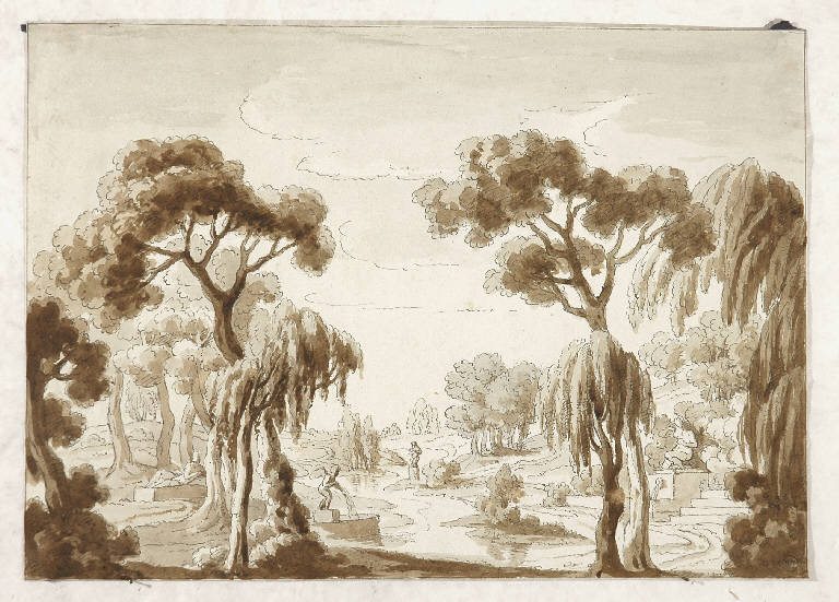 - NOTIZIE STORICO CRITICHE Questo raffinato disegno presenta le consuete caratteristiche della produzione scenografica di Luigi Vacca, pittore decoratore e scenografo attivo per il Teatro Regio di Torino per più di cinquant'anni, dal 1800-1, quando esordisce insieme a Fabrizio Sevesi (1773-1837) e con il quale collaborerà fino alla morte di questi avvenuta nel 1837, sino al 1853. I due autori erano inoltre legati da vincoli di parentela in quanto avevano entrambi sposato due figlie di Giacomo Pregliasco (1759 ca.-post 1823) "disegnatore del vestiario dei teatri torinesi", cioè costumista, del Regio dal 1799, ma attivo anche per il Teatro alla Scala di Milano e progettista anche di alcuni teatri (ristrutturazione del Teatro S. Carlo di Napoli, progettista di quello di Chambery col Sevesi e di quello di Vigevano). La collaborazione tra Vacca e Sevesi, che tra l'altro apparteneva ad un'altra grande famiglia di pittori scenografi, i Galliari, essendo figlio di Ludovica, terza figlia di Fabrizio Galliari, si protrae al Regio, pur con brevi interruzioni, per quasi quarant'anni. Il sodalizio tra i due, operosi anche per il Teatro Carignano di Torino, il primo come decoratore figurista, il secondo come inventore prospettico, è ricordato anche dalle fonti contemporanee: il pittore Francesco Gonin (1808-89) scrive a proposito di Sevesi, nelle sue memorie (1878 ca.), come fosse "artista di grandissimo merito nelle architetture e nelle prospettive", mentre giudica Vacca "colto ... appassionato per l'arte, indole studiosa" (riportato in Viale Ferrero, 1970, p. 182). Si deve peraltro segnalare che Gonin era anch'egli parente di Vacca, avendone sposato la figlia Olimpia. La critica recente sottolinea comunque come il connubio fosse particolarmente proficuo e come entrambi gli autori sapessero adattarsi alle esigenze del teatro di questo lungo periodo: Vacca "adeguandosi in modo efficace al mutare del gusto, dal neoclassicismo al romanticismo medioevaleggiante e goticheggiante, alla ripresa di un Sei-Settecento di maniera" (Viale Ferrero, 1991, p. 472), Sevesi, che nelle scene "in stile" per opere serie appariva più convenzionale poichè meno portato ai toni eroici e solenni, "nelle scene per balli ed opere buffe (...) riacquistava estro e vivacità, perfezionando il gusto per il ritratto di ambiente, già introdotto dai Galliari, con accenti nuovi, di schietta, familiare umanità" (Viale Ferrero, 1970, p. 182). In particolare la scena qui rappresentata non è riferibile con sicurezza ad alcuna opera, ma denota i caratteri stilistici di Vacca sia nell'impianto compositivo che nel modo di utilizzare le piante come quinta, inquadrando lo scorcio di paesaggio con il corso d'acqua e le fontane dello sfondo. Anche il modo di descrivere le chiome frondose degli alberi e le ombreggiature dei tronchi è consueto della sua ricca produzione.