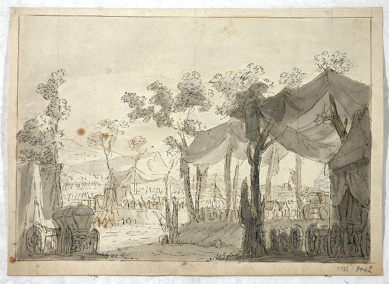 - NOTIZIE STORICO CRITICHE La presenza dell'accampamento con le tende in penombra in primo piano lascia pensare che il disegno sia stato eseguito per l'ambientazione di un'opera di soggetto storico.