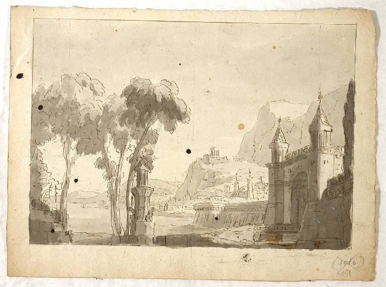- NOTIZIE STORICO CRITICHE Non è stata identificata l'opera di riferimento per questo disegno con le mura fortificate di una città posta ai piedi di una zona montuosa. L'annotazione "Vacca" sembra apposta dal collezionista.