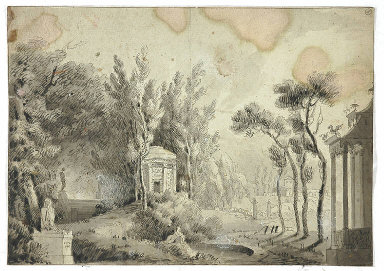 Schizzo per scena raffigurante un parco con tempietti, scalinate e fontane. PAESAGGIO