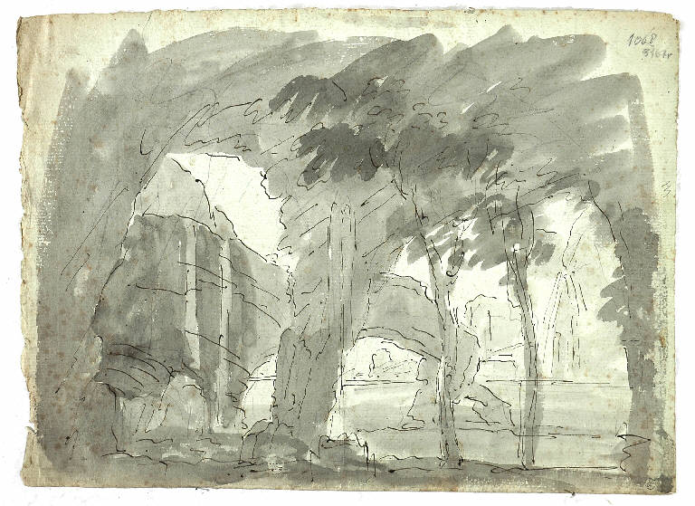 Scena con arco naturale/ Schizzo per scena raffigurante un esterno architettonico con piante. PAESAGGIO/ PAESAGGIO CON ARCHITETTURE